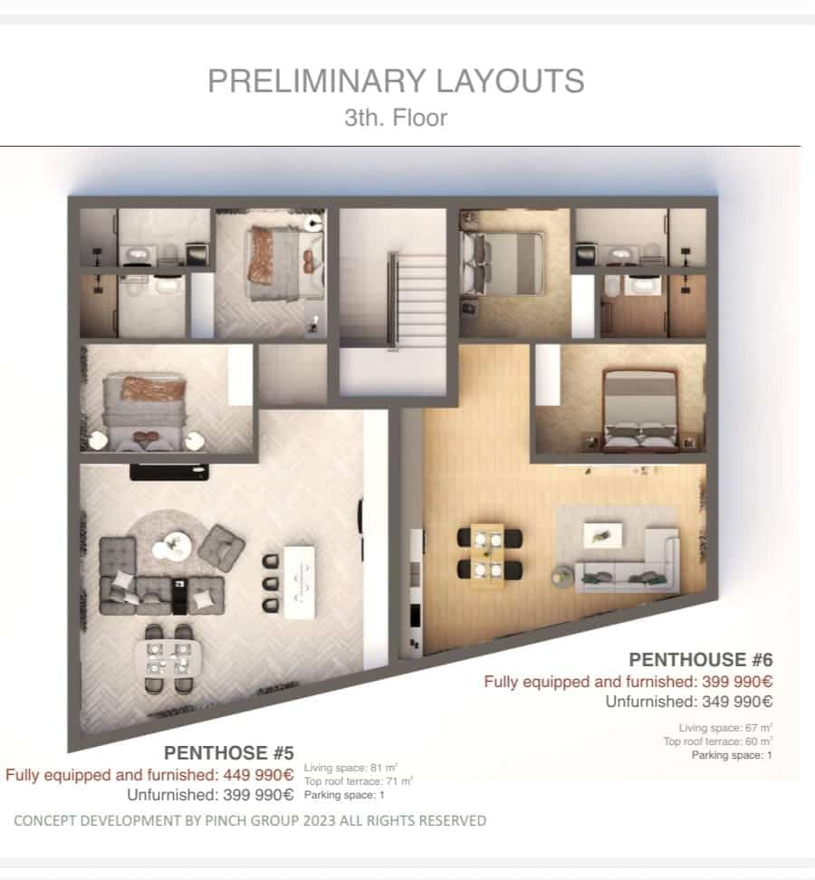 Each apartment comes with one private parking space. Units are delivered either unfurnished (€349,990) or fully furnished and equipped (€399,990), ready for immediate occupancy or tourist rental.