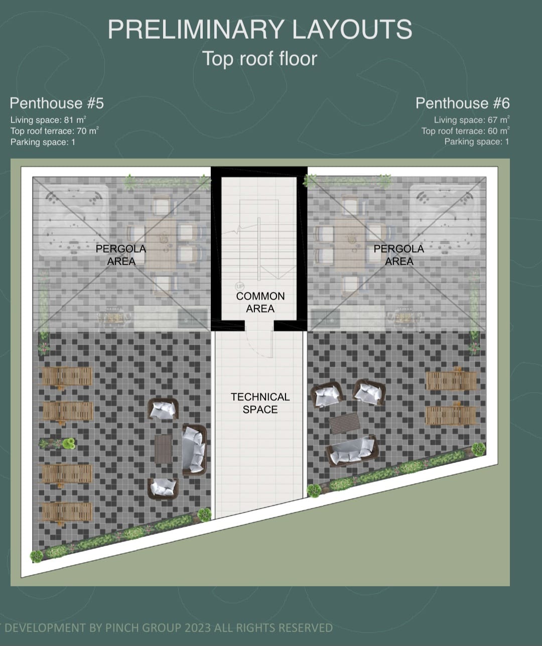 The layout includes a bright open-plan living and dining area with a modern kitchen, two bedrooms, and a stylish bathroom. The highlight of the property is the spacious 60 m² rooftop terrace, offering panoramic views, ideal for outdoor relaxation, entertaining, or creating exclusive rental features.